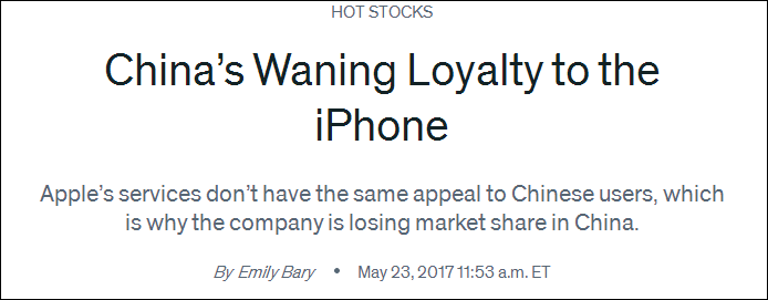 根据国际数据公司(IDC)的数据,2017年第一季度,苹果在中国市场的占有率从2016年第一季度的12.7%下降至9.6%;第一季度iPhone在中国市场的份额下滑,位列第四,前三名被中国本土品牌包揽。iPhone出货量同比减少26.7%,反之竞争对手均保持增长,而华为的出货量更是同比增长约25.5%。